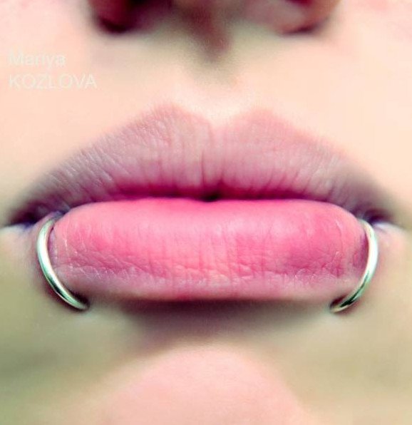 Прокол губы лабрет колечко - еще один вариант пирсинга, который может быть выполнен с использованием кольца вместо шарика на конце. Кольцо может придать образу более романтичный и женственный вид.