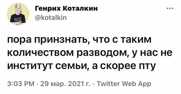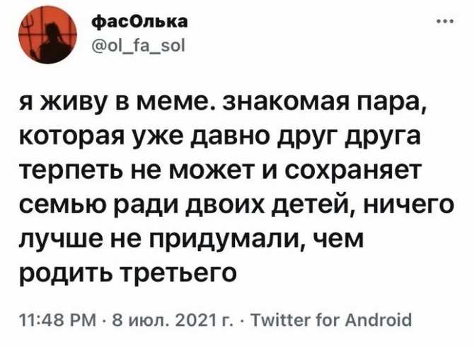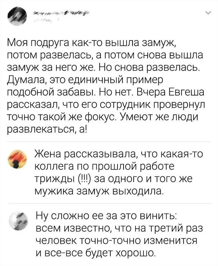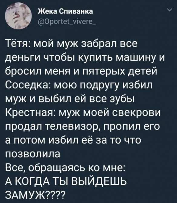 Традиционные брак и семья издавна уже трещат по швам. Но тем не наименее повсевременно всё новые и новые люди связываю себя супружескими узами. Может быть, перед столь решаительным шагом им стоило бы пролистать пару подобных постов...