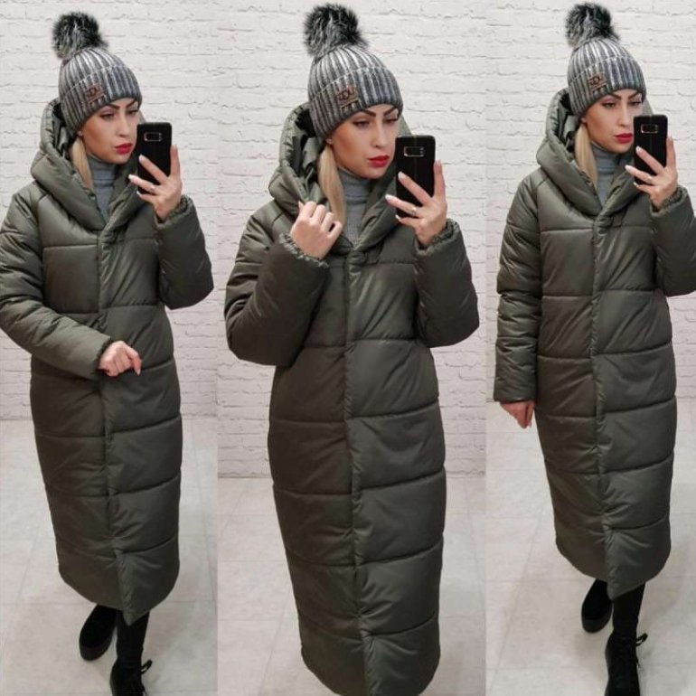 Пуховик сероватый дамский длиннющий.