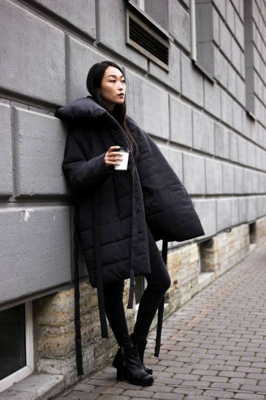 Темный пуховик оверсайз стрит стайл.
