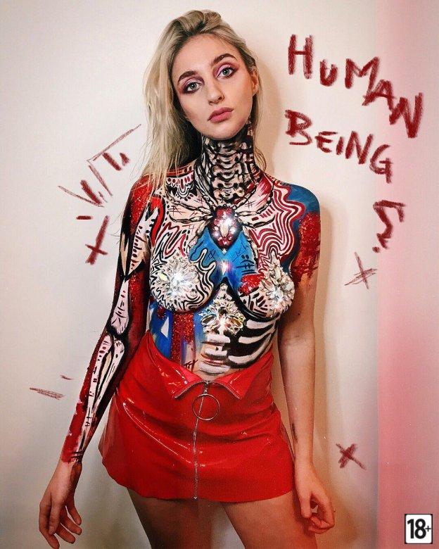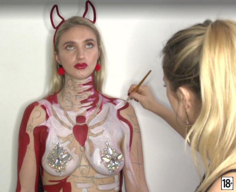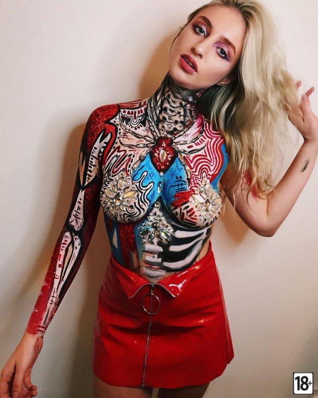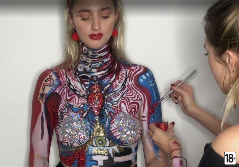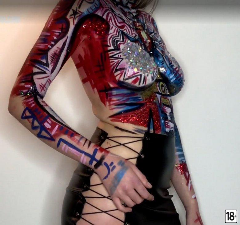 Фото этого костюма вызывает сильное возбуждение, когда видишь, как драгоценные камни и блестки обрамляют тело модели. Визажист из Лондона Миа Кеннингтон умудрилась превратить обычную куртку в настоящий эротический шедевр, а видео лишь добавляет интриги и жару.