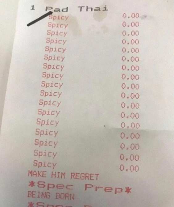 "Я произнес, что мой пад тай был недостаточно острым в крайний раз, и попросил сделать его поострее. Вот мой счет"