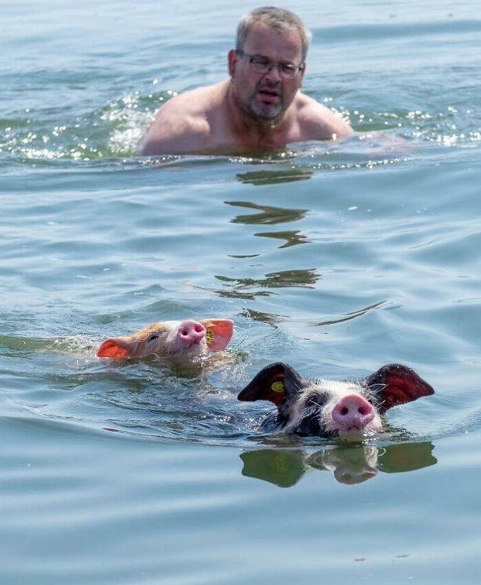 19. В Нидерландах фермер пошел поплавать, чтобы спастись от жары, и взял с собой пару свинок