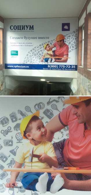Реклама негосударственного пенсионного фонда. Почему они в касках?Почему ребенок прибивает палку к собственной ноге?Эта палка висит в воздухе?Хороша перспектива стабильного грядущего...