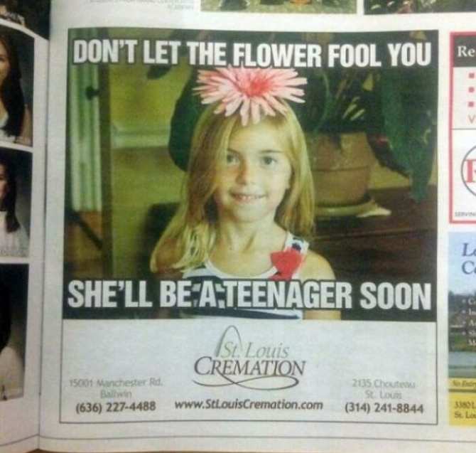 Я не знаю, что больше сбивает с толку, цветок на ее голове, надпись - "Не позволяй цветку одурачить тебя, Шелл, скоро ты станешь подростком" либо тот факт, что это объявление помещено поверх объявления о кремации?Избавьте собственного малыша от боли, когда он станет ребенком, приведите его сейчас на кремацию в Сент-Луис!