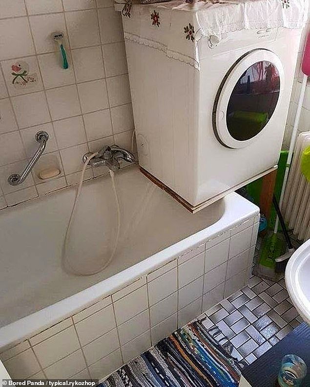 3. Предприимчивый дизайнер оптимизирует место в маленькой ванной комнате, устанавливая стиральную машинку прямо над ванной.