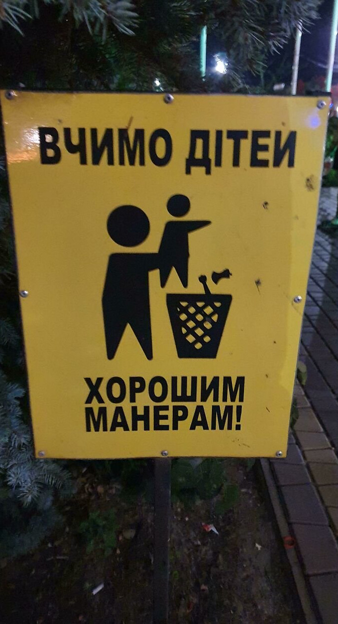 Символ гласит: «Учите малышей неплохим манерам», но похоже, что вы просто бросаете малыша в мусорное ведро