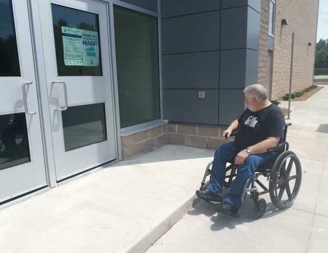 В новой школе в моем районе есть клавиша доступа для инвалидного кресла за дверью, но человеку в инвалидном кресле не добраться до нее
