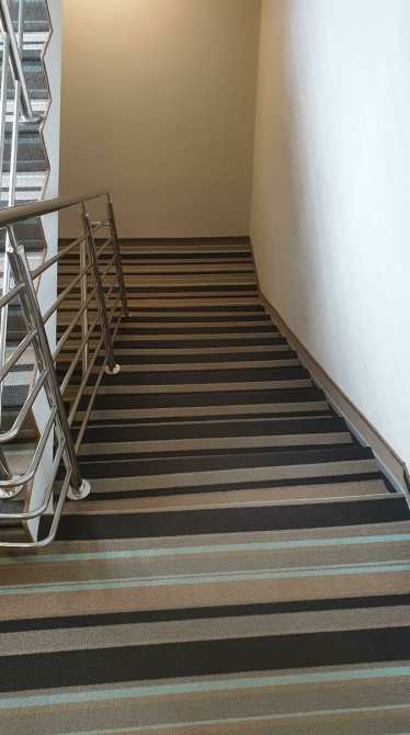 Полосатый ковер на лестнице гостиницы. Очень тяжело идти даже трезвому человеку