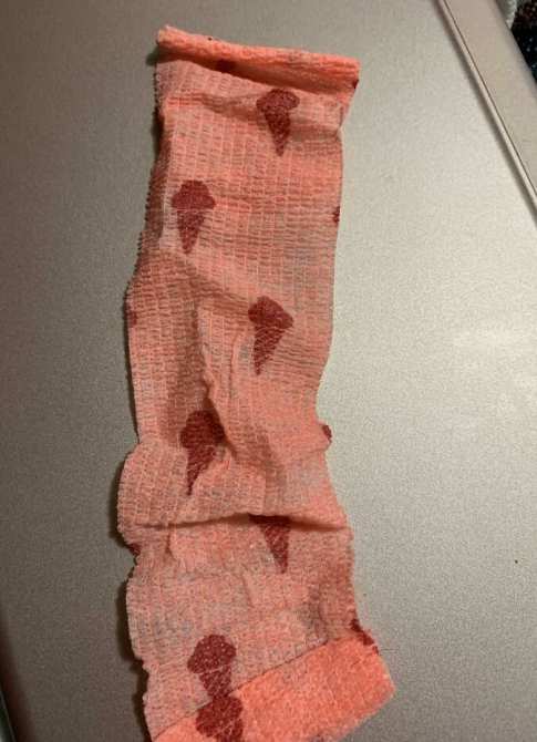 Повязка. Это не кровь, это очень красные рожки мороженого, да!