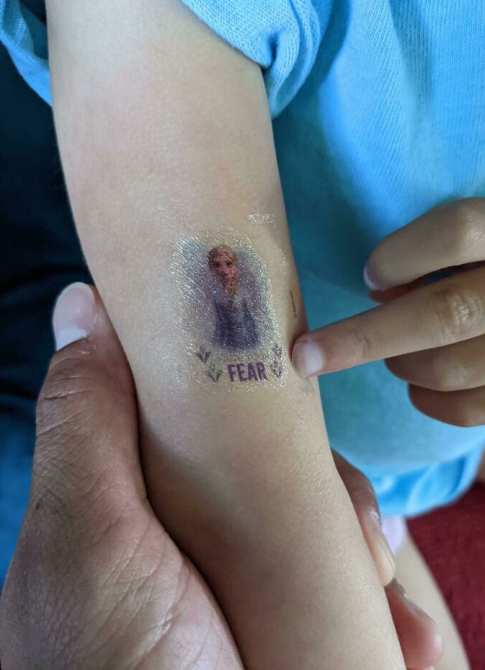 Предполагается, что на данной временной татуировке Frozen 2 написано: «Взгляни в лицо своему страху», но 1-ые два слова написаны оранжевым цветом