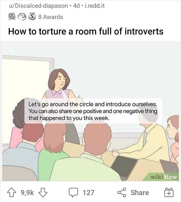 1. Как замучить комнату, полную интровертов: "И так ребятки, давайте пойдем по кругу, и представимся. Также вы сможете поделиться позитивом и негативом, который случился у вас на данной неделе"