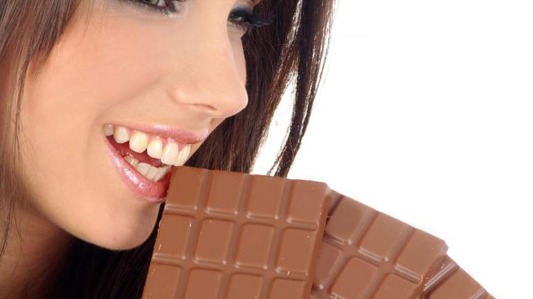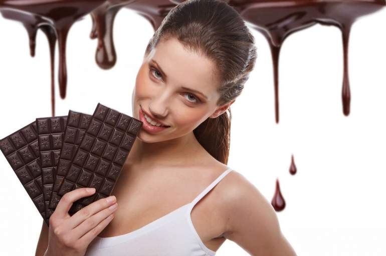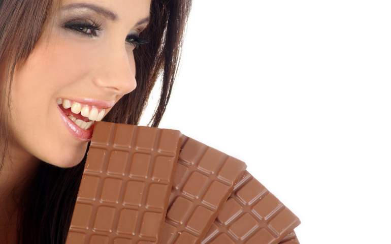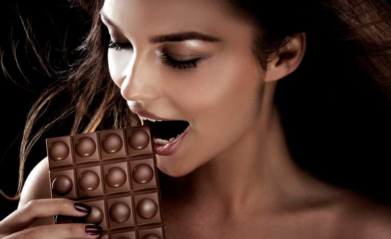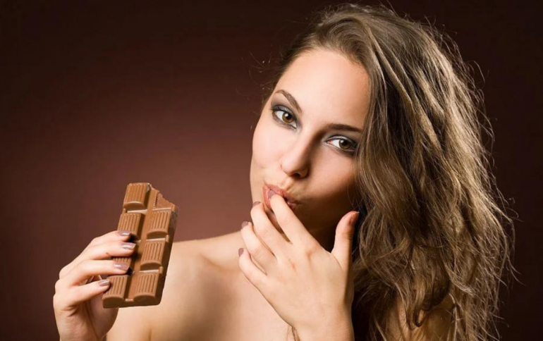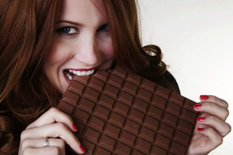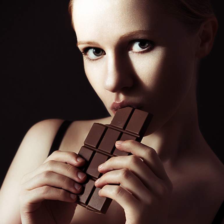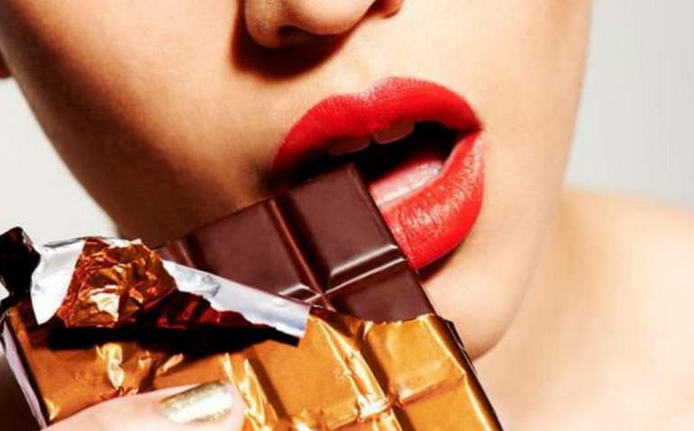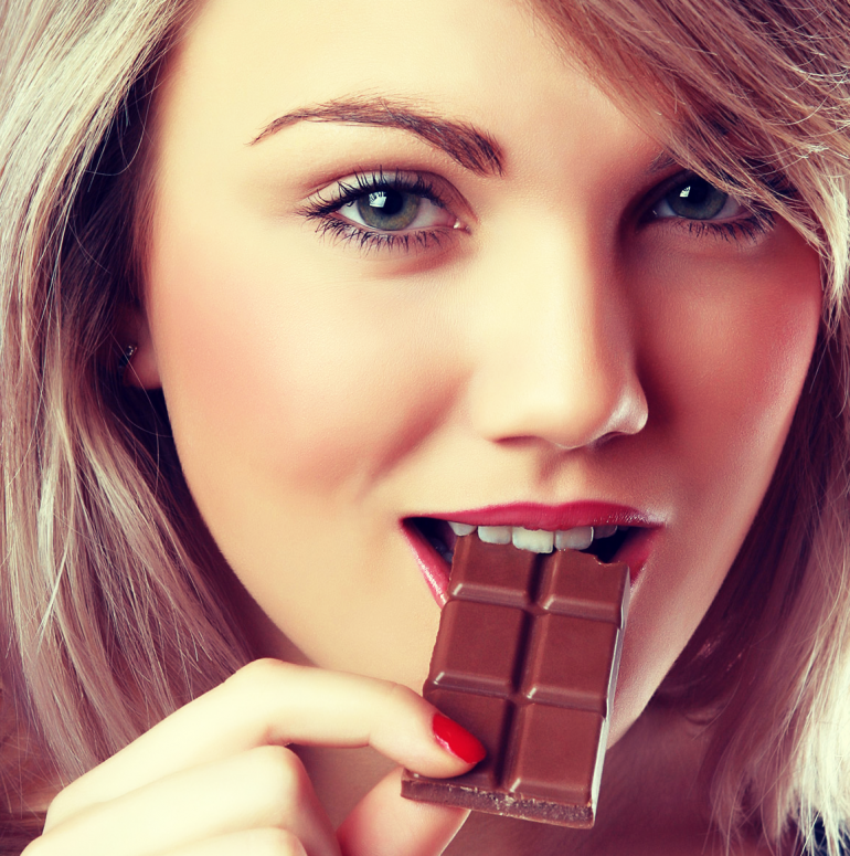 Девушка ест шоколад