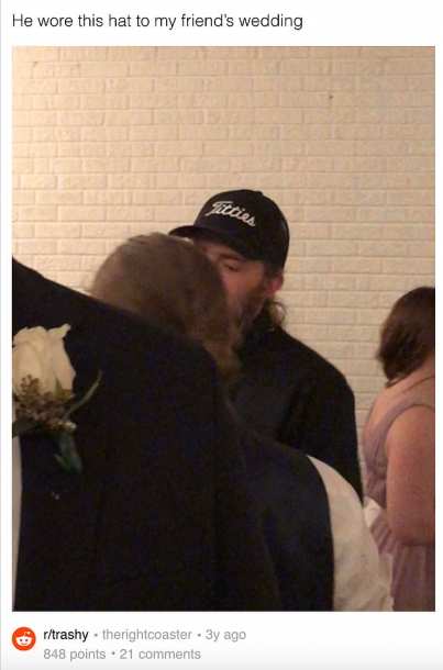 7. Достойный конкурент: друг на свадьбе в кепке с надписью "сиськи". Ну что, нечем крыть?:)
