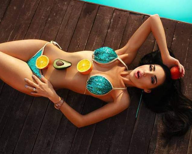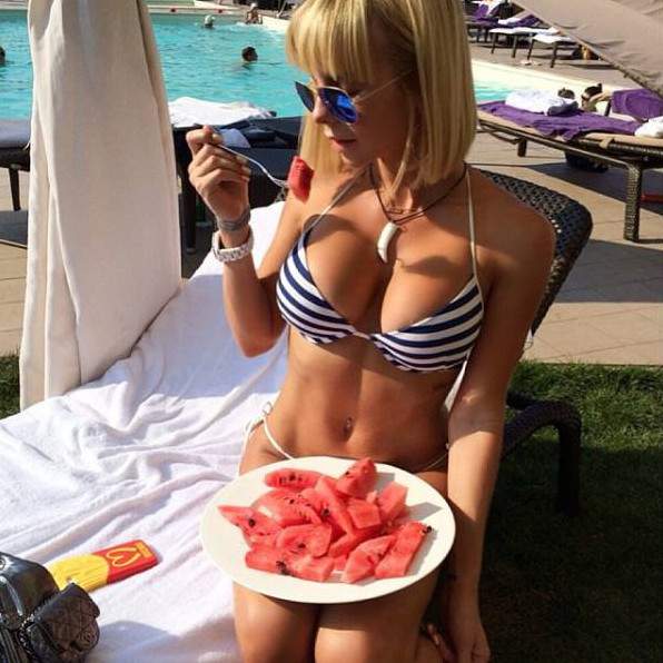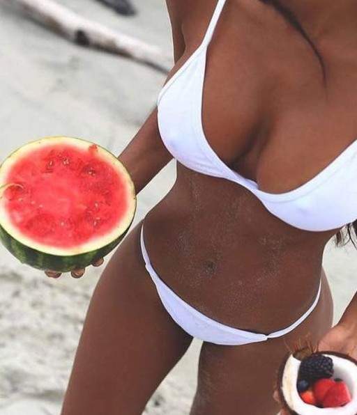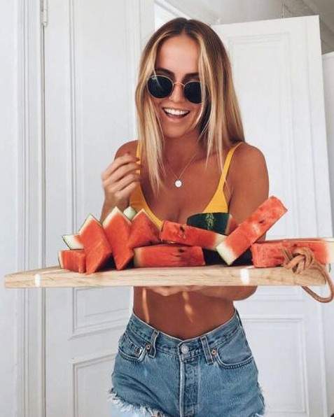 Шатенка эротично кушает арбуз.