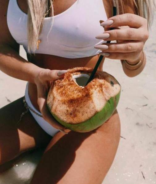 Сочная девушка в летнем кафе пьёт коктейль.