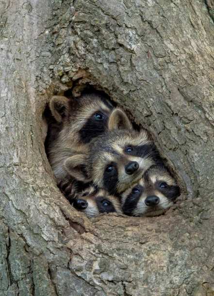 «Семья енотов в дупле. Эта фото была изготовлена в Юго-Западном Онтарио, Канада. Я наткнулся на эту семью случаем. Еноты были очень любопытны(и сговорчивы), высунули головы, чтобы рассмотреть меня ближе!"