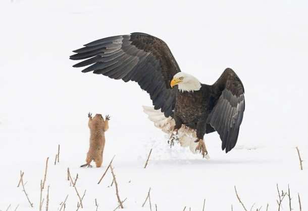 «Когда этот белоголовый орлан промахнулся при попытке схватить эту луговую собаку, луговая собачка прыгнула к орлу и испугала его, чтобы сбежать в ближайшую нору. Реальная история Давида против Голиафа!»
