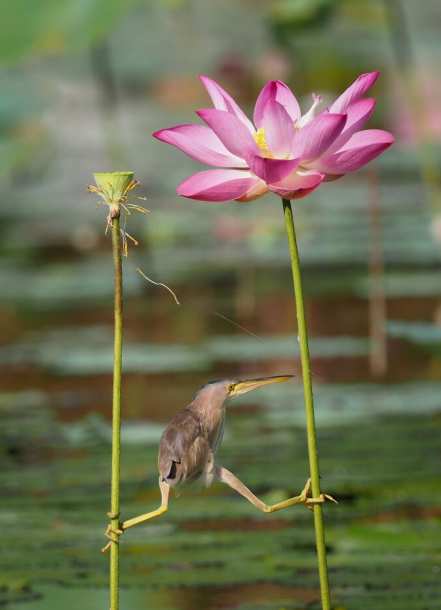 «Желтоватая выпь изо всех сил пыталась занять удобную для охоты позицию. Я сделал этот снимок, когда она находилась между 2-мя стволами лотоса».