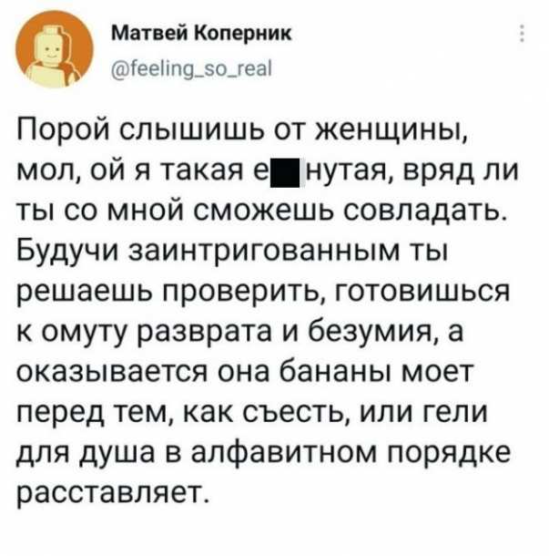 Юмор про отношения между мужчинами и женщинами Приколы 30-05-2021, 17:50 697 Коллекция шуток, мемов и приколов от юзеров социальных сетей о особенностях отношений между мужчинами и дамами. Давайте оценим их юмор, в продолжении.