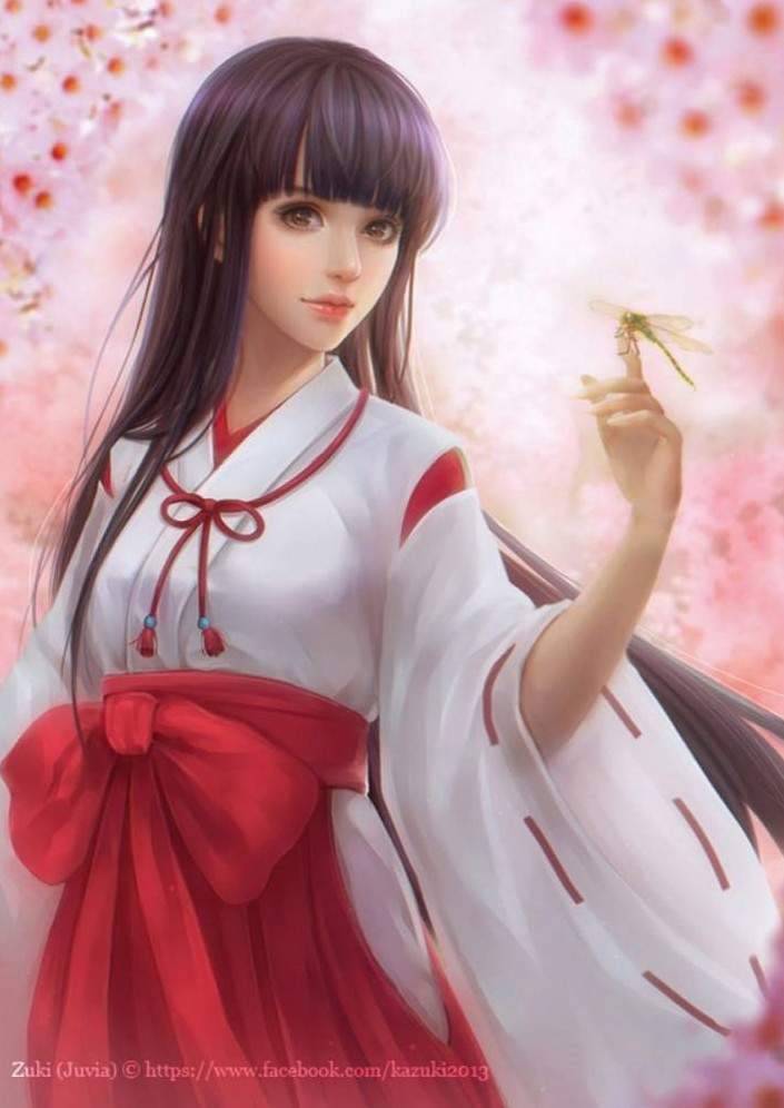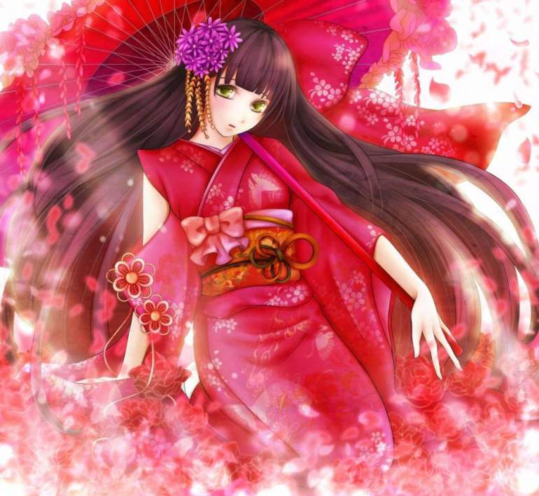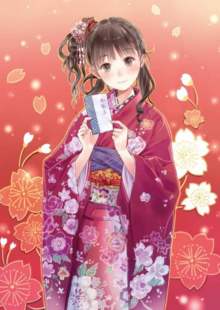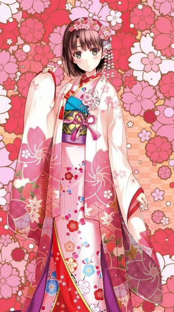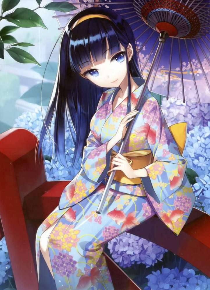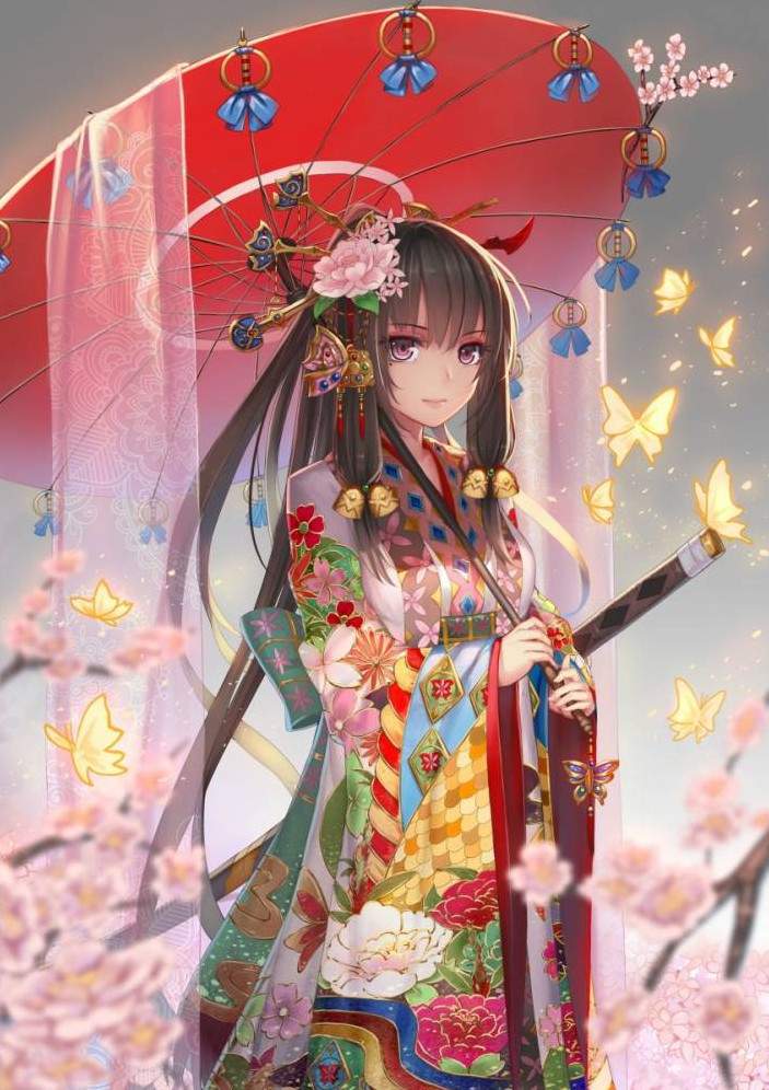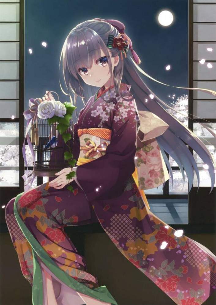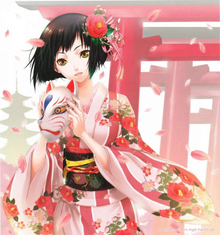 Картинки Аниме девушка красавица в кимоно с маленькими волосами.