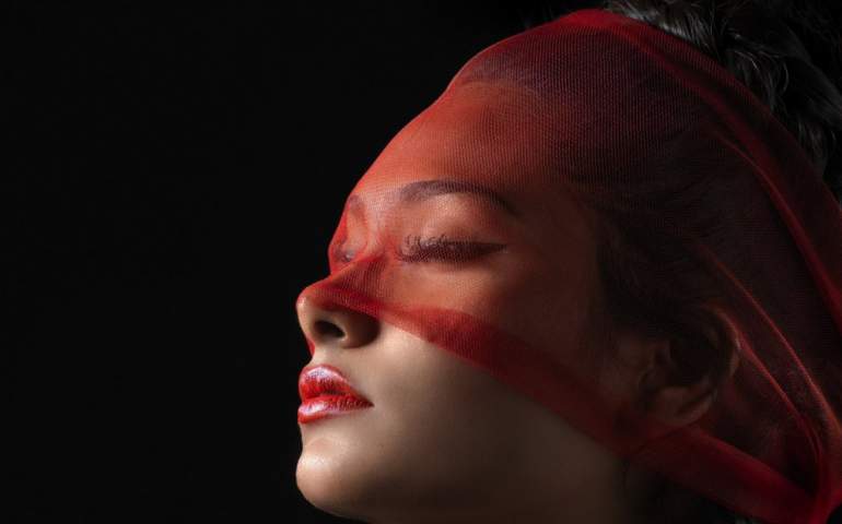 Девушка красавица с красной вуалью.